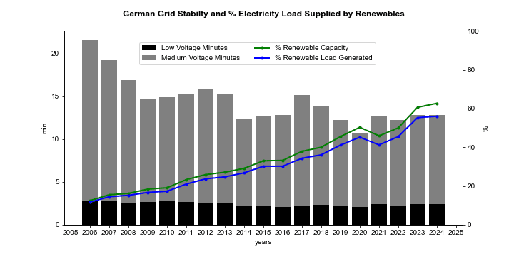Germany reports grid stability data as the number of minutes per year that the grid voltage deviates from the specified operating range. Despite recent major disruptions to both electricity supply and demand, in the form of the pandemic and the war in Ukraine, the German grid has gradually experienced fewer minutes of disruption over the last two decades as the supply of electricity generated by renewables has climbed to reach nearly 60% of demand. The Fraunhofer Institute asserts that this relationship is causative and is attributable to 1) the vast majority of photovoltaic (PV) solar installations in Germany being at the community scale or smaller, and 2) those distributed installations accounting for more than half the total PV-generating capacity in the country. Distributed rooftop and community solar by definition supplies energy in a distributed manner and reduces demand on the larger grid, thereby stabilizing the larger grid. There is no reason to expect this result to be localized to Germany, and, indeed, it is clearly apparent in another large economy.