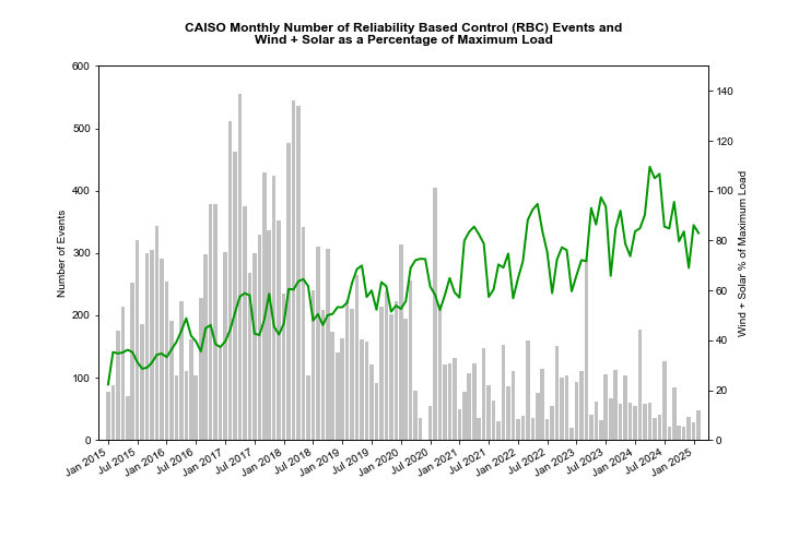 The California grid operator, CAISO, reports grid stability as the number Reliability Based Control (RBC) events per month, which occur when the frequency of the grid deviates above or below the standard of 60 Hz. The RBC count has clearly fallen to multi-decadal lows even as renewable electricity generation has approached, and even surpassed, 100% of load.