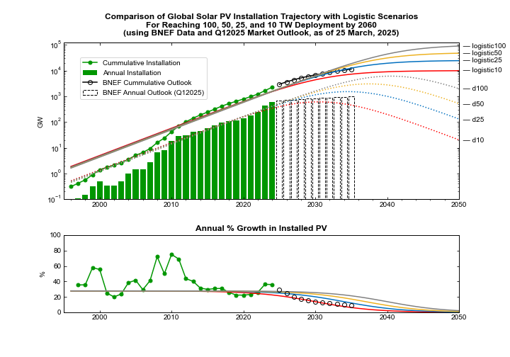 Top panel: Four scenarios for future global PV installation, ranging from 10 TW to 100 TW. Historical data for annual installation (green bars) and cumulative PV capacity (solid green line through data points); the four scenarios for future annual PV installation (dotted lines) and future cumulative capacity (solid lines) are each consistent with historical data. Additionally, the installation forecast from the BNEF Q1 2025 Market Outlook is shown as open boxes with dashed black outline, and the resulting cumulative forecast shown as open black circles. The scenarios are not quantitatively fit to the historical data. Bottom panel: The annual percentage increase in installed PV for the same four scenarios plotted in comparison to historical percentage increases. The percentage increase implicit in the BNEF Q1 202t installation forecast out to 2035 is shown as open black circles (Source: BloombergNEF, Planetary Technologies).