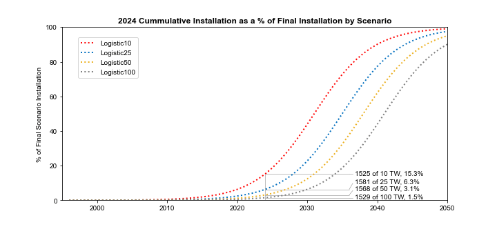 Finally, to try to put the four scenarios in historical context, here is a previously unpublished chart that estimates how far we are along each scenario based on historical data. If we are destined to install only 10 TW, then we are already about 15% of the way there, and a transition to linear growth should happen soon. But if we going to see 100 TW of solar installed by between 2050 and 2060, then we are only 1.5% into the transition, and we should expect to see at least another ten years of exponential growth.
